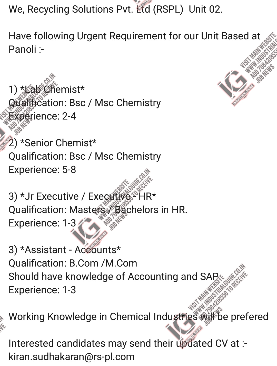 RSPL Panoli jobs for Bsc Msc Lab Chemist HR Accountant apply now