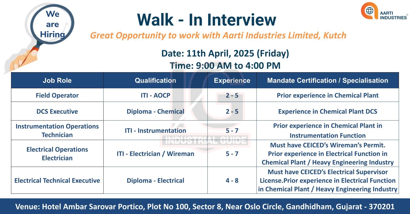HomeChemical industry Aarti Industries Ltd Gujarat interview in 11th April 2025 jobs for Field operator DCS Instrumentation electrician and executive check now Interview Data Loading …[ads id="ads1"]🔶 WhatsApp Pro Group🔶 WhatsApp Group - Gujarat🔶 WhatsApp Group - India🔶 Upload your Latest Resume - Click here 🔶 Contribute knowledge - Interview Questions book[ads id="ads1"] Industrial Courses - Improve your knowledge Available in all Indian languages Chemical StorageChemical ReactorIndustrial Equipment'sDistillation - ProCentrifugal Pump - ProUtility CoursePumpsPiping - Valves, Piping Equipment'sBasic Industrial ConceptsHeat Exchangers - ProInstrumentation IndustrialEfficient Equipment's OperationQC QA R&D BlogsSafety ElectricalIndustrial PoliciesTaxation GuideCareer Guide Blogs[ads id="ads1"]Interview Questions [Result oriented collection] 1️⃣ Technical interview Questions2️⃣ Centrifugal Pump Interview Questions3️⃣ Chemical Reactor Related interview Questions4️⃣ Distillation interview Questions 5️⃣ Pumps Interview Questions6️⃣ Valves Interview Questions7️⃣ DCS Distributed Control System Interview Questions8️⃣ Heat exchangers Interview Questions9️⃣ Safety Interview Questions1️⃣0️⃣ Pharmaceutical Interview Questions1️⃣1️⃣ HR Interview Question Check Disclaimer, Privacy policy for use this data
